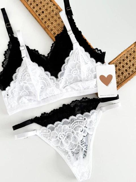 Combo conjunto esme x 2 blanco y negro. Conjunto de encaje con bombacha regulable less del mismo material.
