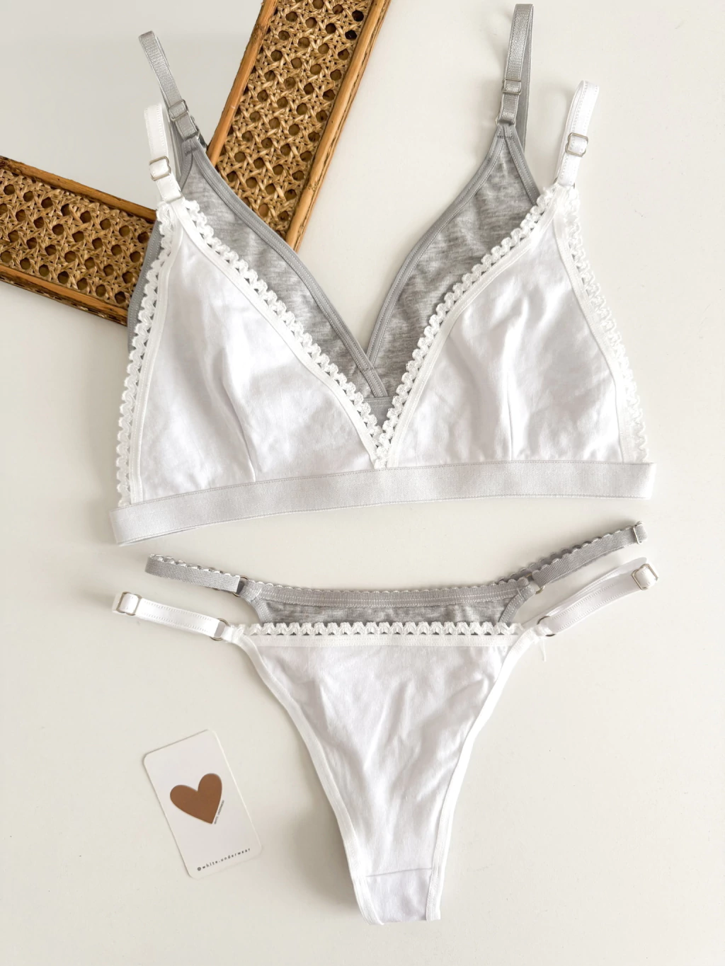 Conjunto Triángulo de algodon, con elástico de base ancho. con bombacha less regulable del mismo material. (La imagen del modelo puede variar de acuerdo a las tandas de producción, algunas no vienen con la puntilla decorativa que se muestra en la foto)